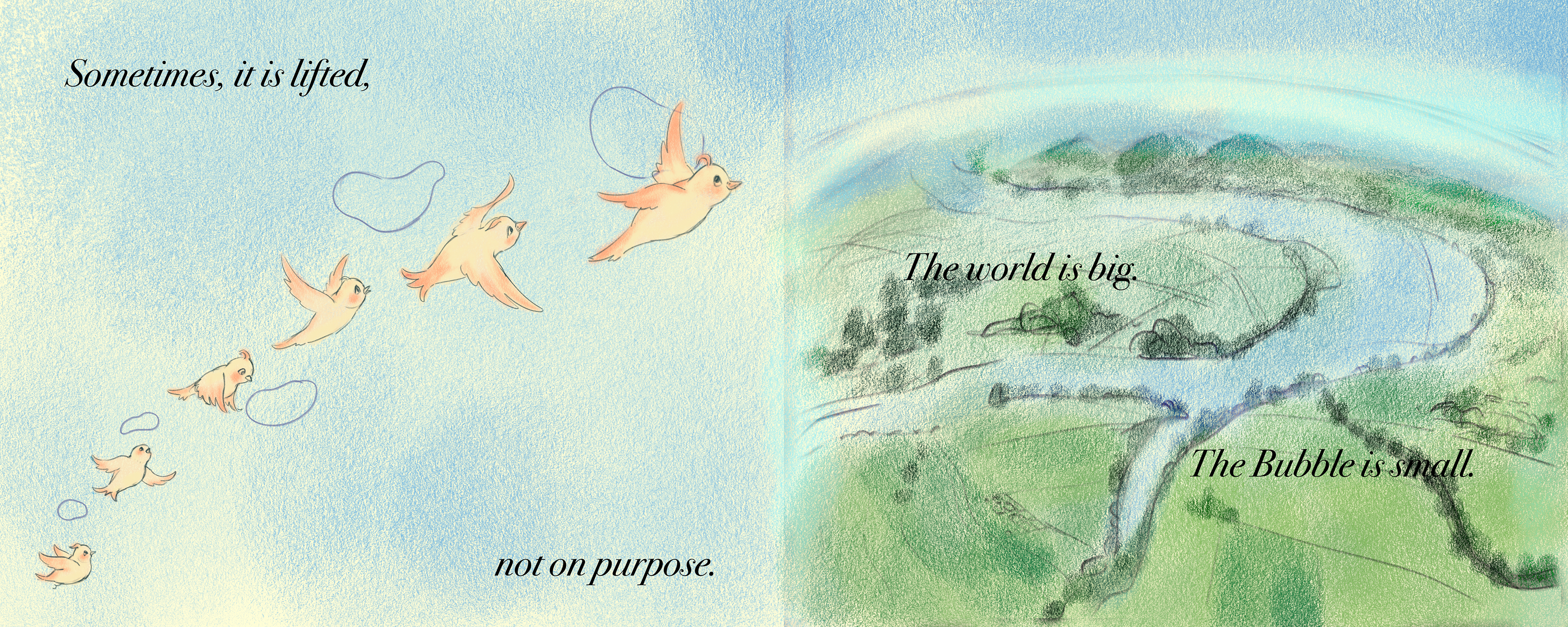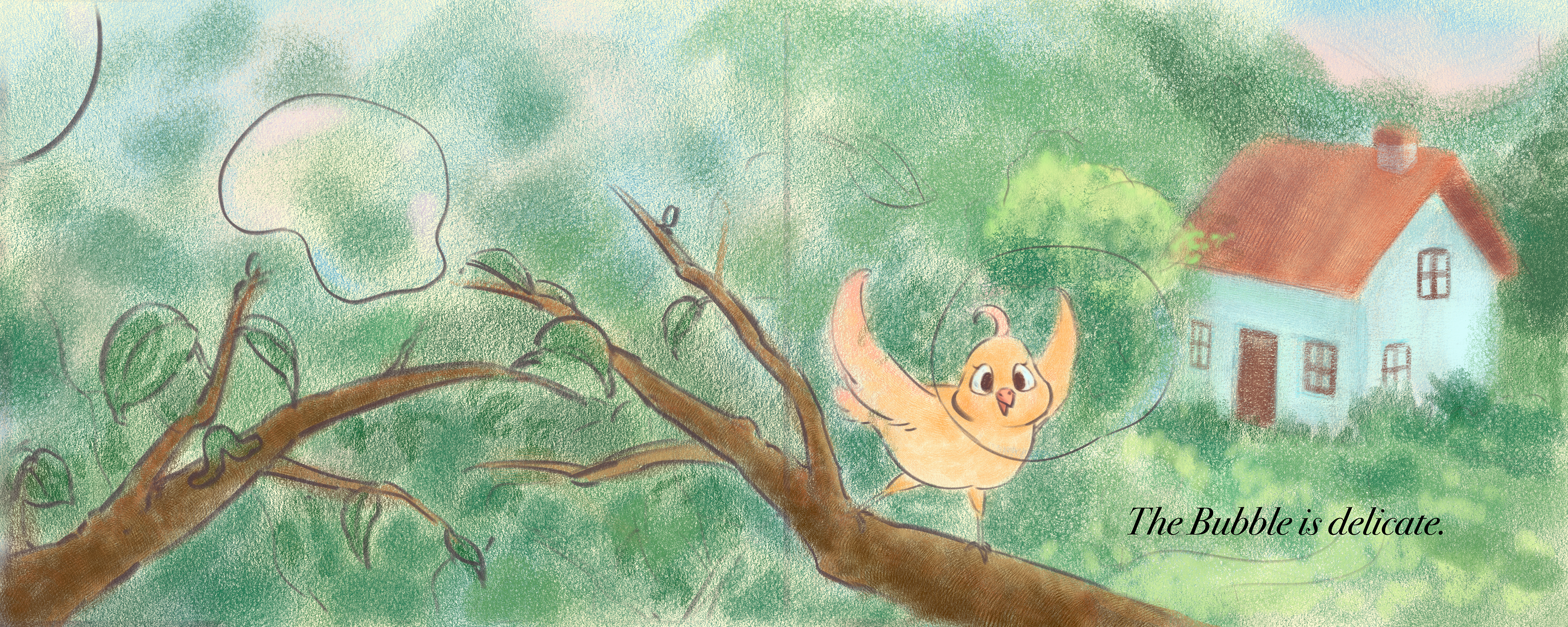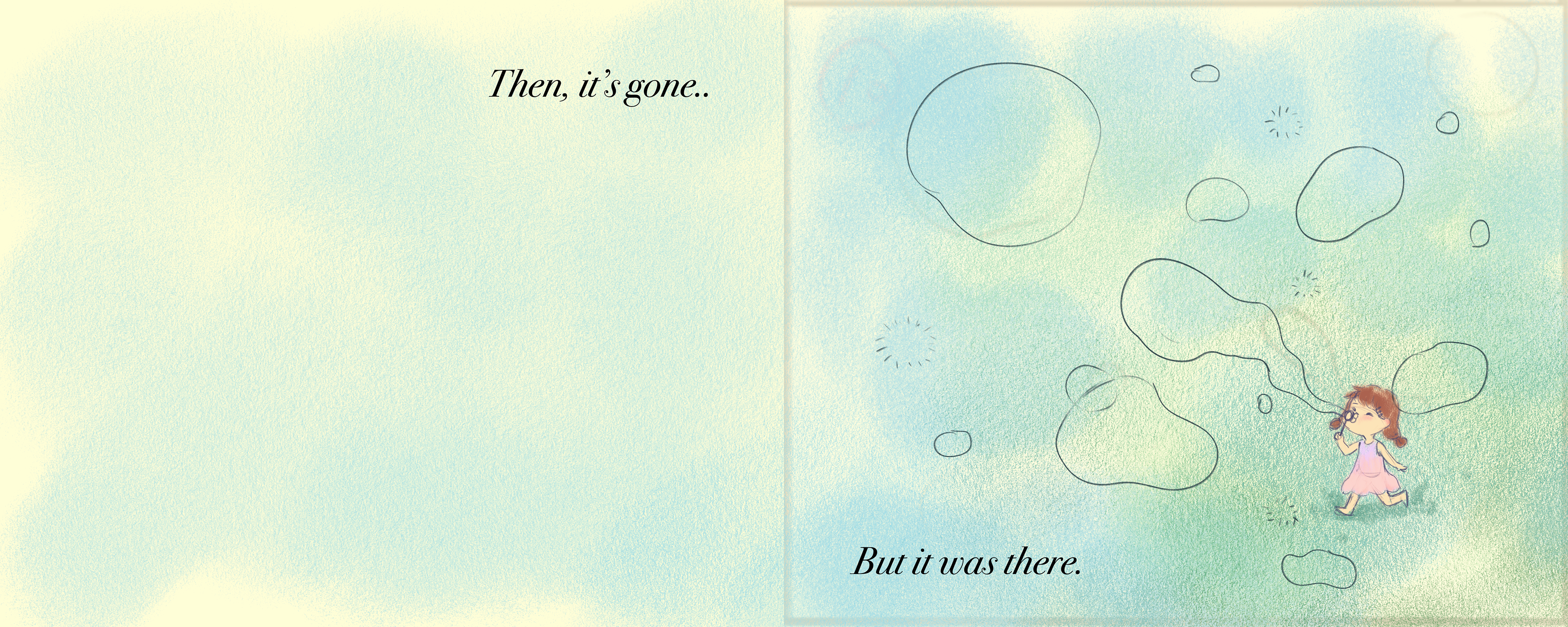 A Bubble’s Life is an in-progress children’s picture book project told through minimal text and visual storytelling. The narrative follows the journey of a single bubble as it drifts through different environments, encountering moments of beauty, danger, and uncertainty. While accessible to young readers, the story functions as a metaphor for a human life, exploring themes of growth, fragility, chance, and letting go. The project is planned as a ten-page digital picture book, using a soft pastel colour palette and pencil-like textures to evoke warmth and vulnerability. By relying primarily on imagery rather than text, the book invites readers to interpret the story emotionally and intuitively. A Bubble’s Life demonstrates my interest in wordless and minimal-text narratives and my ongoing exploration of pacing, atmosphere, and visual storytelling within children’s publishing.