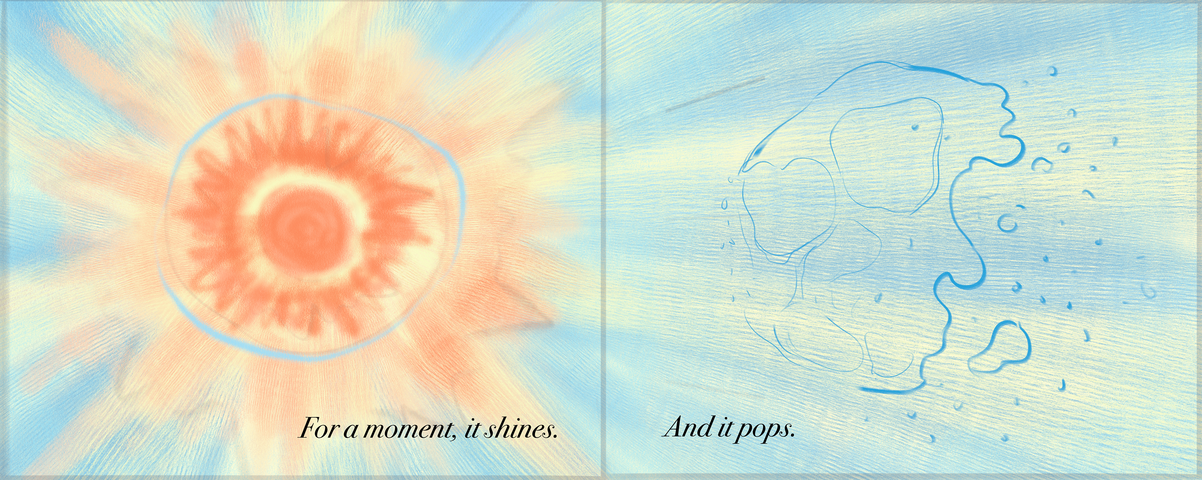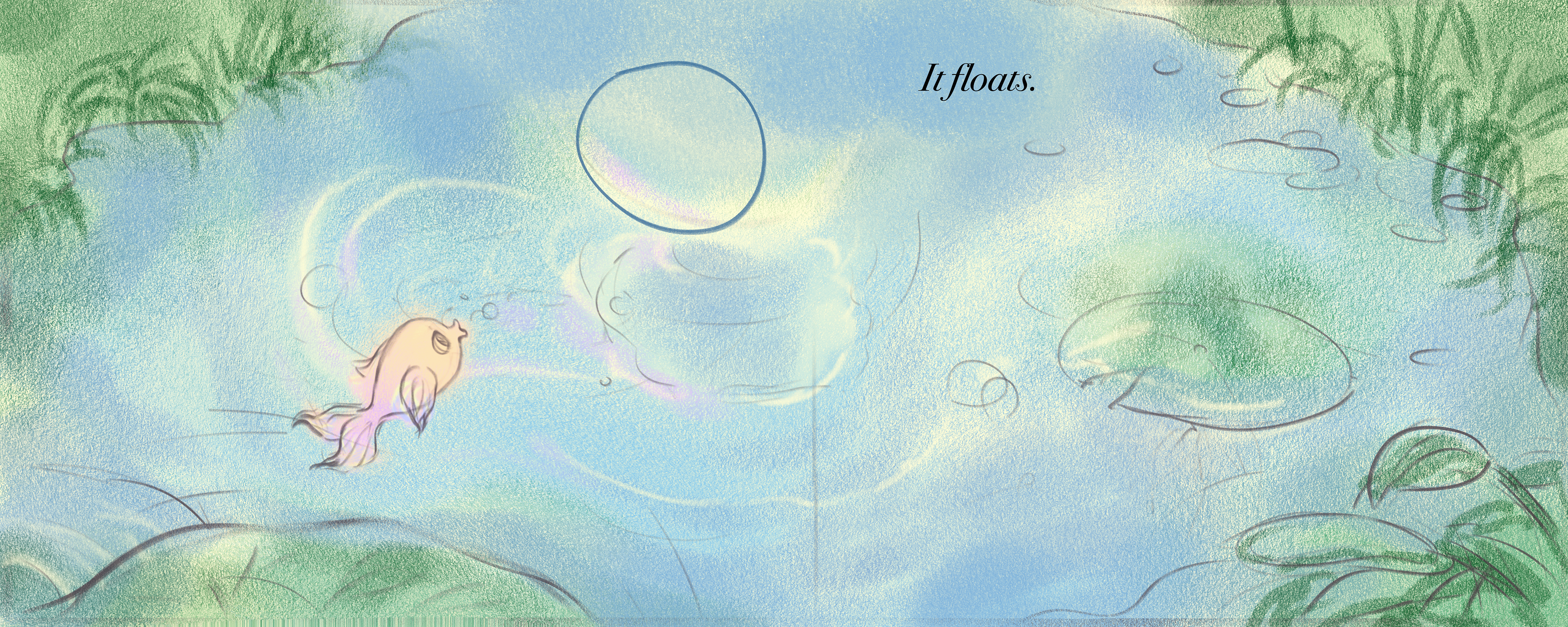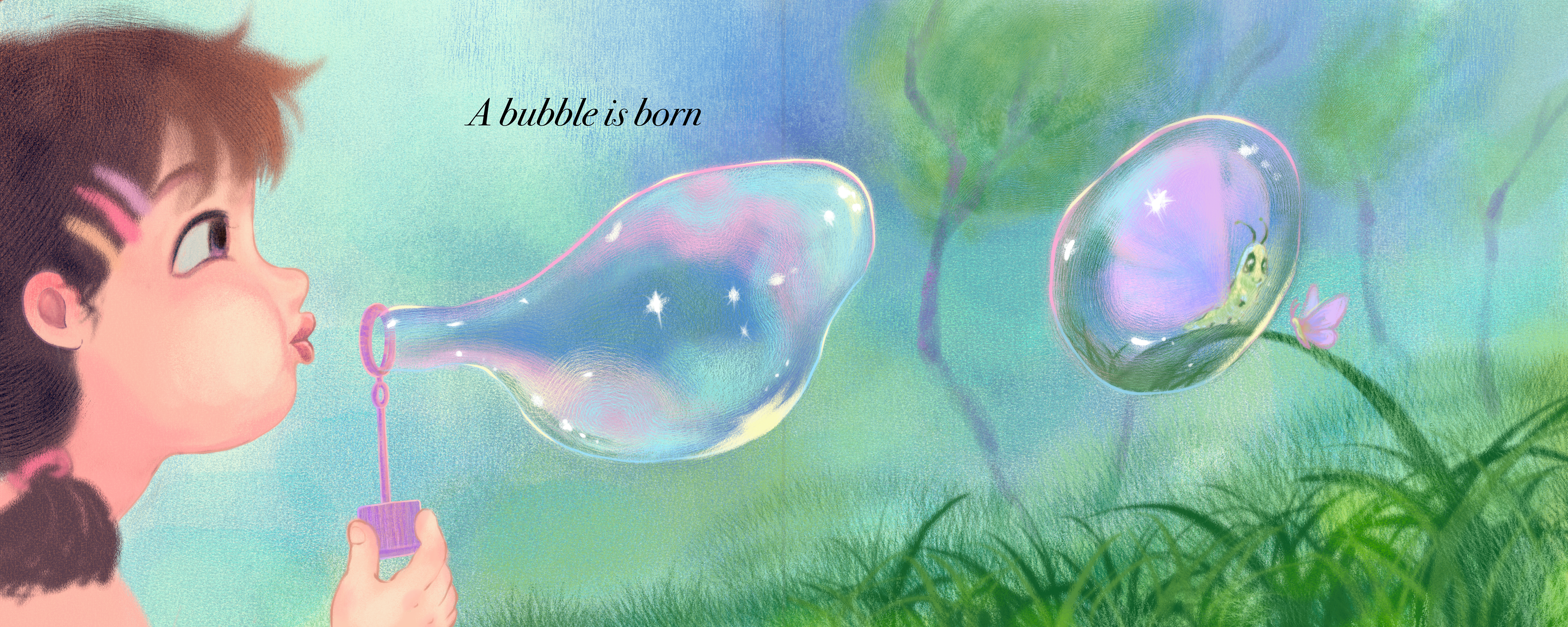 A Bubble’s Life is an in-progress children’s picture book project told through minimal text and visual storytelling. The narrative follows the journey of a single bubble as it drifts through different environments, encountering moments of beauty, danger, and uncertainty. While accessible to young readers, the story functions as a metaphor for a human life, exploring themes of growth, fragility, chance, and letting go. The project is planned as a ten-page digital picture book, using a soft pastel colour palette and pencil-like textures to evoke warmth and vulnerability. By relying primarily on imagery rather than text, the book invites readers to interpret the story emotionally and intuitively. A Bubble’s Life demonstrates my interest in wordless and minimal-text narratives and my ongoing exploration of pacing, atmosphere, and visual storytelling within children’s publishing.
