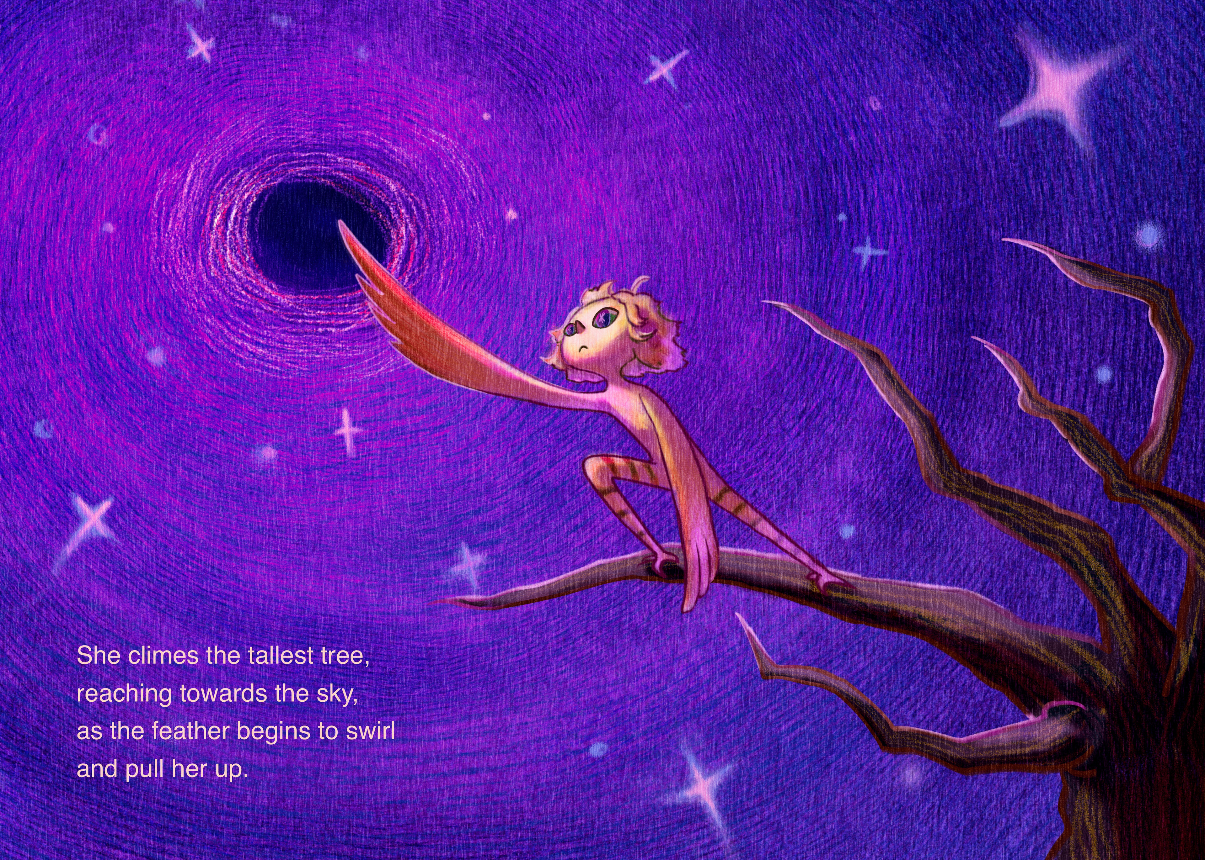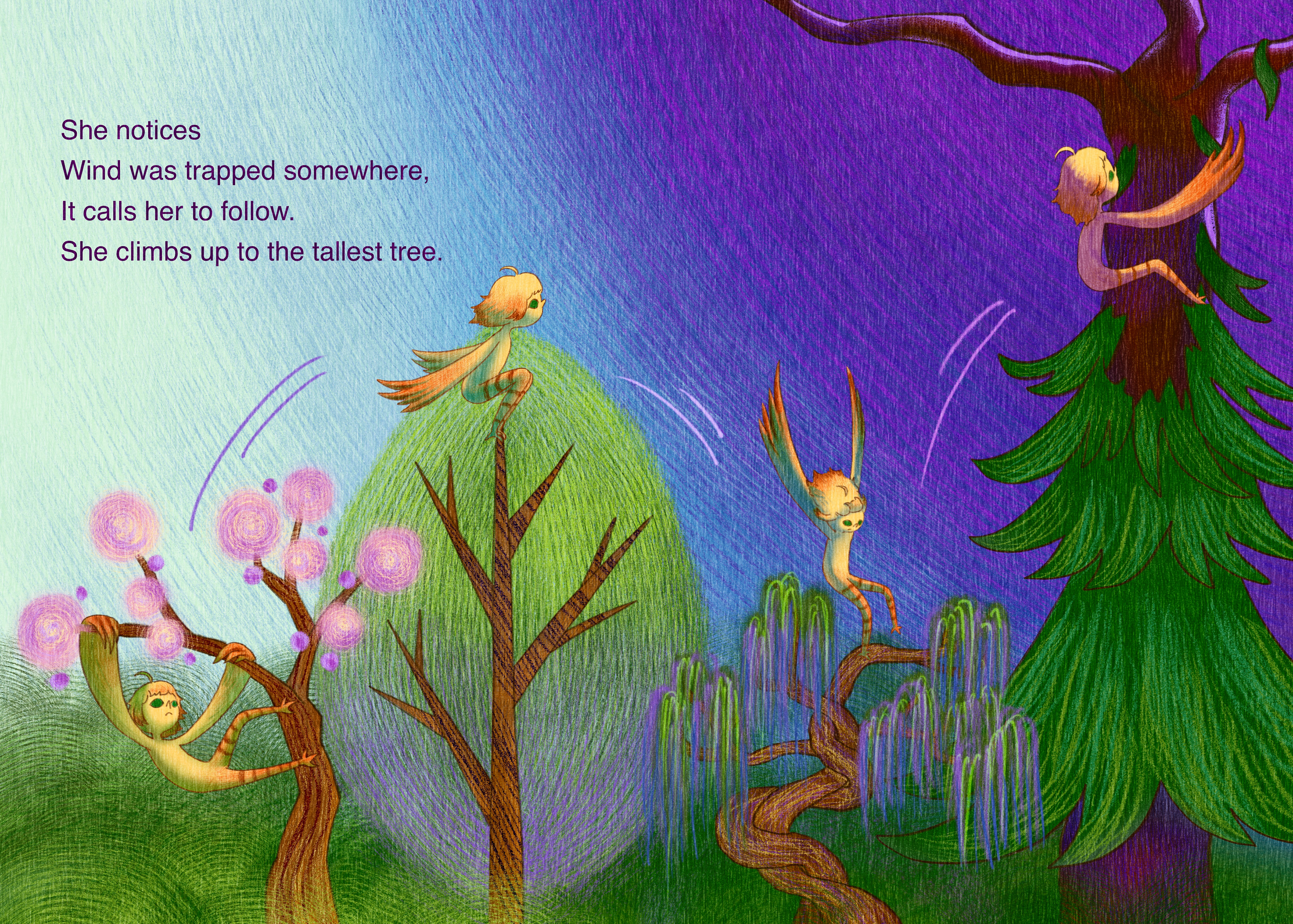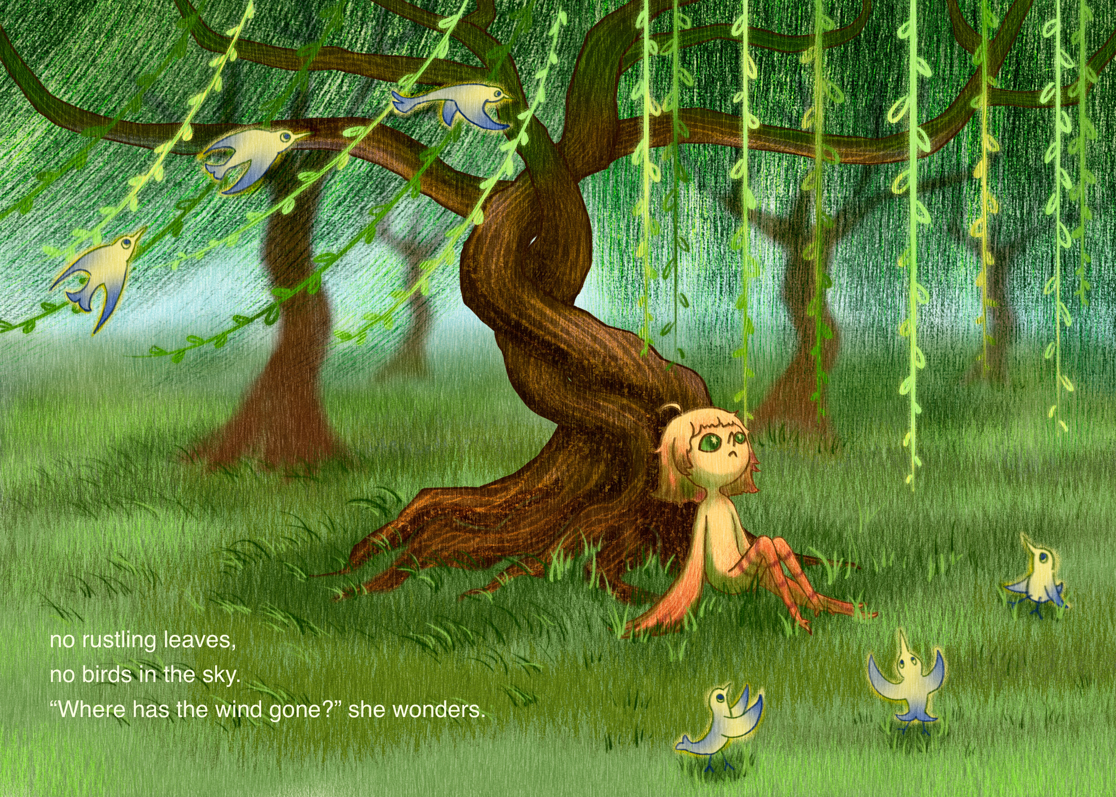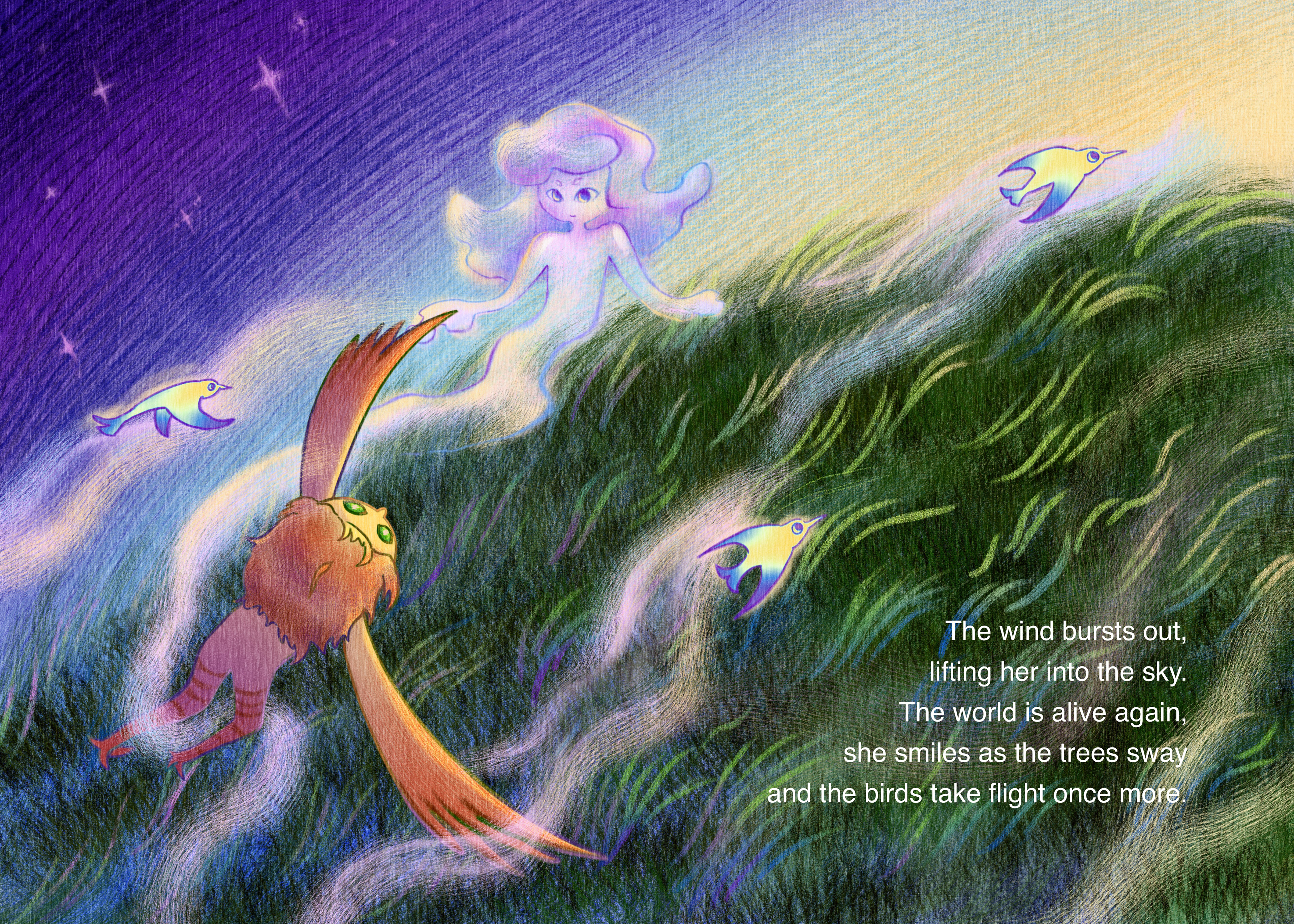 The Girl Who Stole the Wind is a children's picture book concept centered on curiosity, movement, and imagination. The story follows a young girl who discovers that the wind has mysteriously disappeared from the world, leaving nature still and lifeless. Determined to bring it back, she embarks on a journey that gradually restores movement, freedom, and balance to her surroundings. The illustrations are envisioned in a dreamy, painterly digital style, using a contrast of warm and cool tones to emphasize the shift between stillness and motion. Composition and atmosphere play a central role in expressing emotion and narrative flow, particularly in moments of flight and release. Created for young readers, this project reflects my interest in poetic storytelling and using illustration to communicate abstract ideas through visual narrative.
